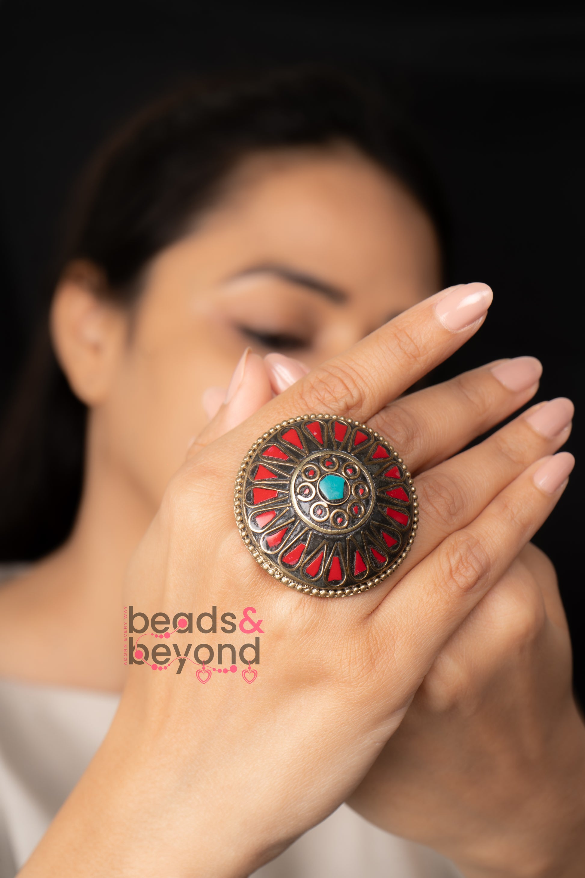 Experience boho vibes with our Chank Ring, a unique and fusion design made of non-allergic and tarnish-free material. This statement ring features an oxidized finish in a captivating golden tone and is adjustable to all sizes. Make a bold and stylish statement with this versatile and durable accessory.