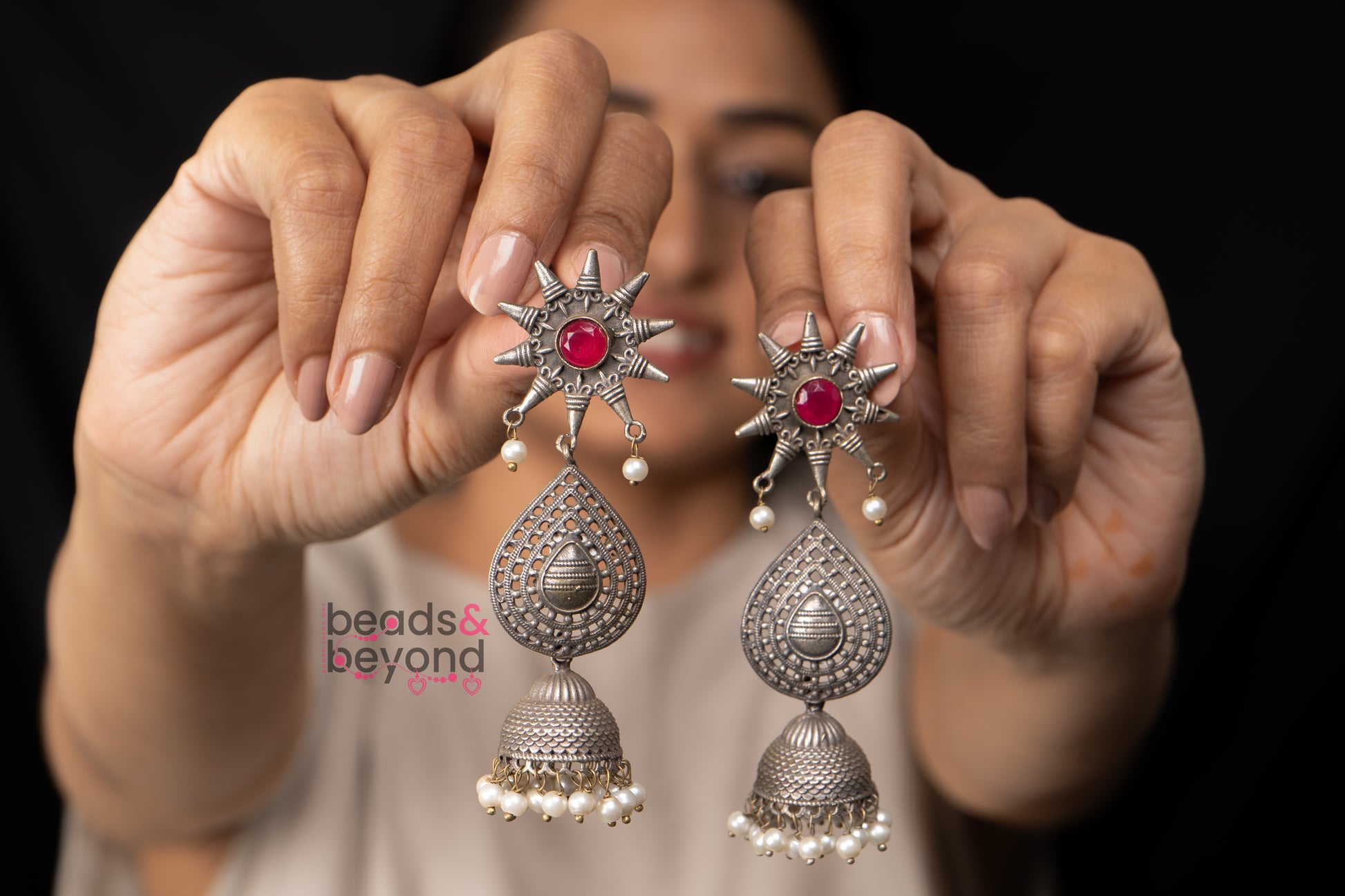 "Dazzle in Crimson! Elevate your style game with these exquisite red stone dangler earrings. Crafted from non-allergic, tarnish-free material, these oxidized beauties are perfect for fusion wear. Their unique design adds a touch of elegance to any outfit. Dare to be different with these stunning female jewelry pieces. #ElegantFusion #TarnishFreeGlam #RedStoneRadiance 💃💎✨"