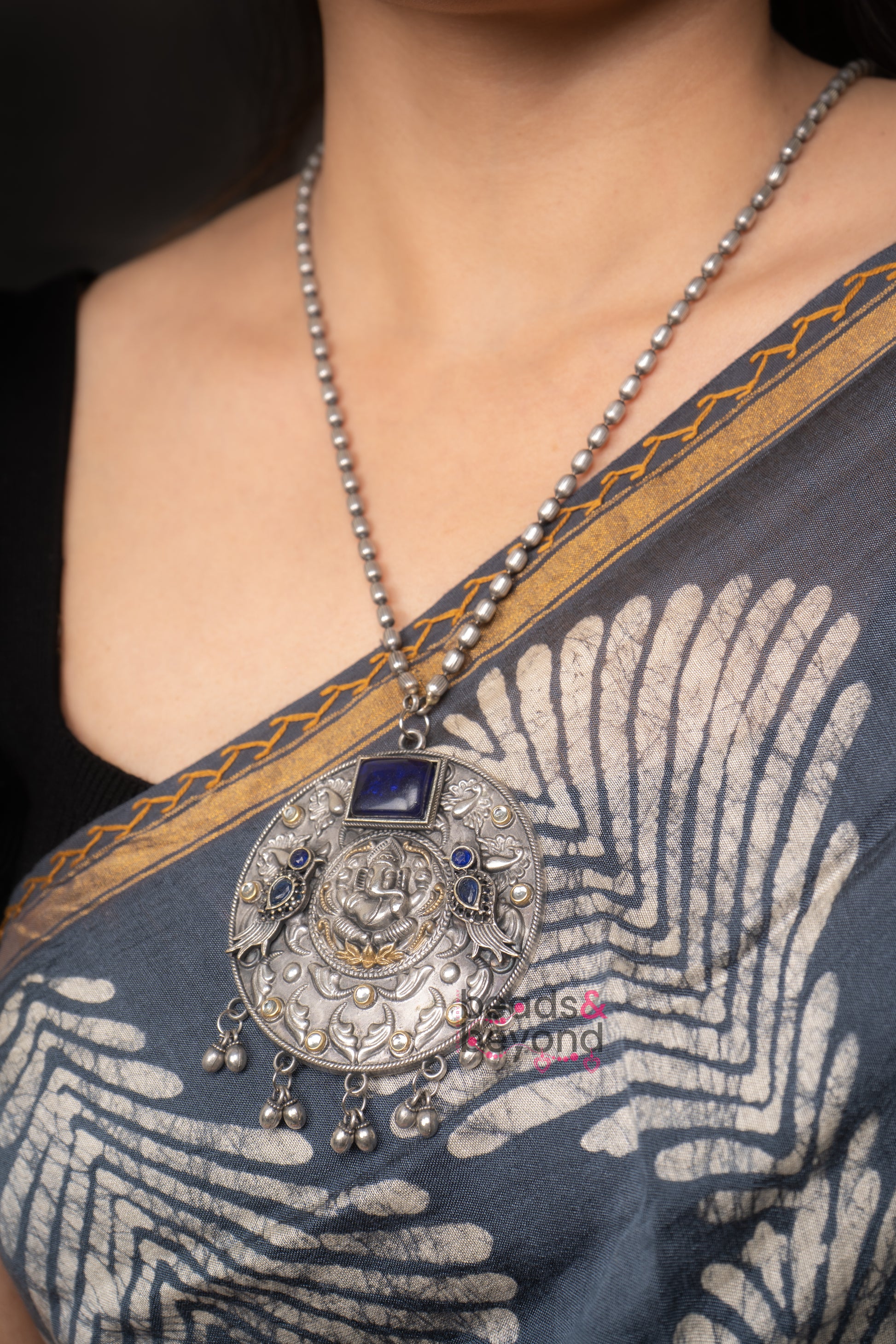 Adorn yourself with divine elegance through this silver look-alike long necklace, beautifully crafted with a Ganesh motif surrounded by graceful birds. ✨ The subtle blue tone adds serenity, while the oxidised finish enhances its fusion design. Made of tarnish-free, non-allergic material, this unique piece blends spirituality with boho vibes and modern trends. A statement accessory that reflects artistry, devotion, and style, making it perfect for festive wear or everyday grace. 🌿💙 #BohoElegance #FusionJewelry #GaneshDesign